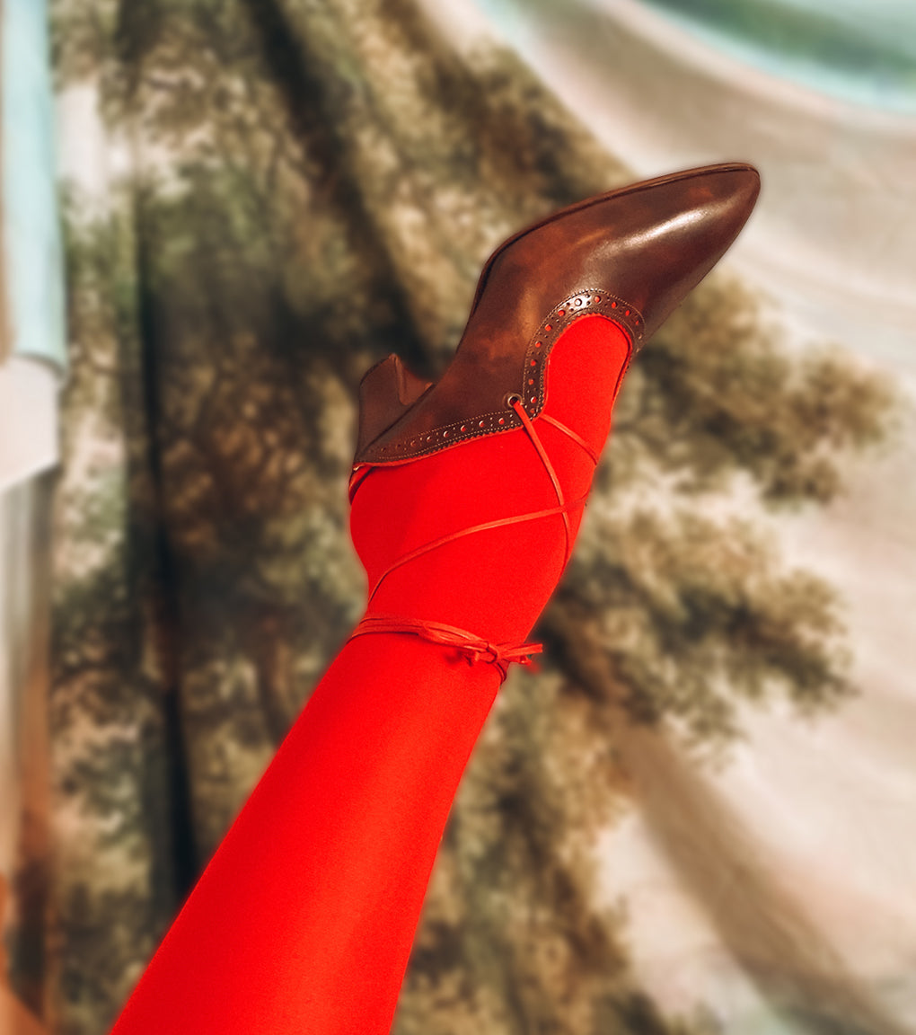 Artisanally crafted in my atelier, the ATHENA features a pointed/almond toe, and brogued decoration. It ties with laces/ribbons to allow for flexibility and modification.